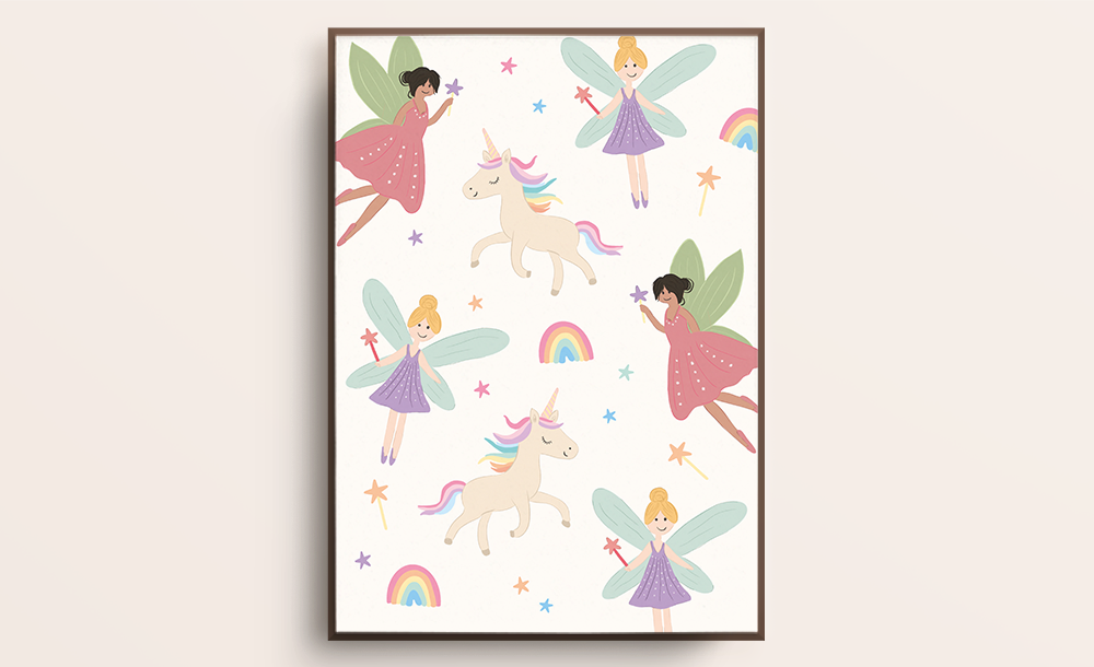 Poster met illustraties van unicorns & feeën. De illustratie is door ons gemaakt en de poster is gedrukt op hoge kwaliteit 170 grams papier. Ideaal als cadeau!