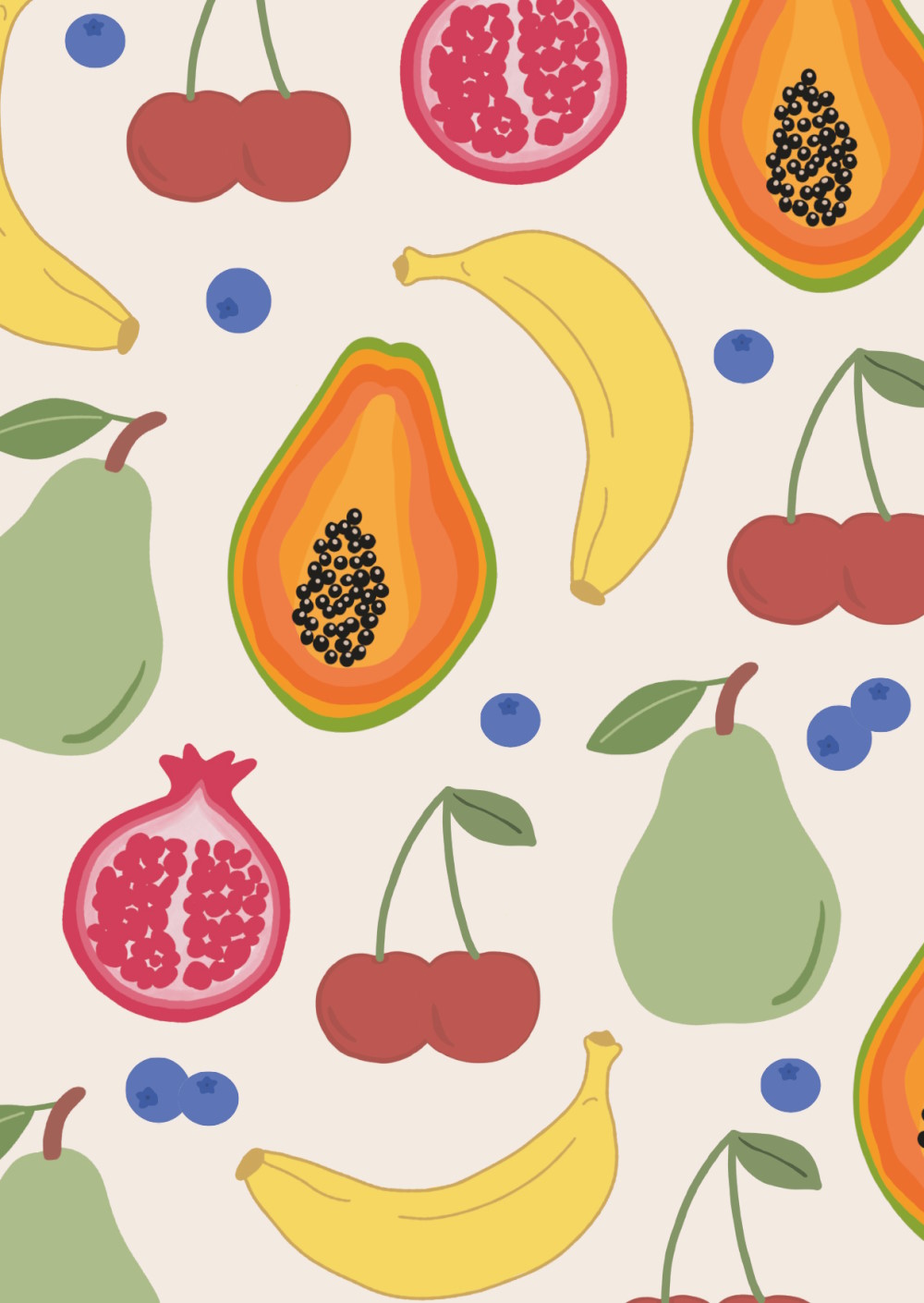 Een kaart met een print van fruit. De illustratie is door ons vormgegeven en gedrukt op mooi dik duurzaam papier.