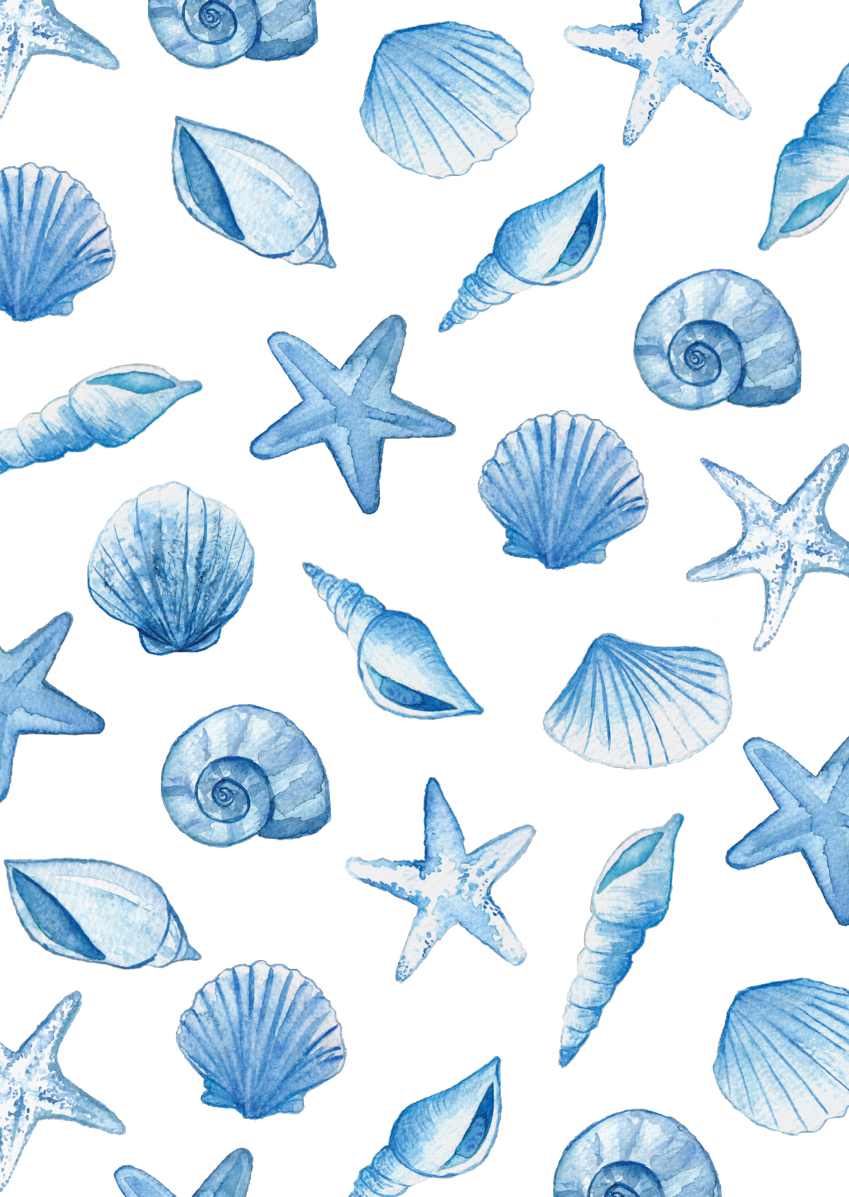 Een kaart met een print van blauwe schelpen. De illustratie is door ons geschilderd in aquarel en gedrukt op mooi dik duurzaam papier.