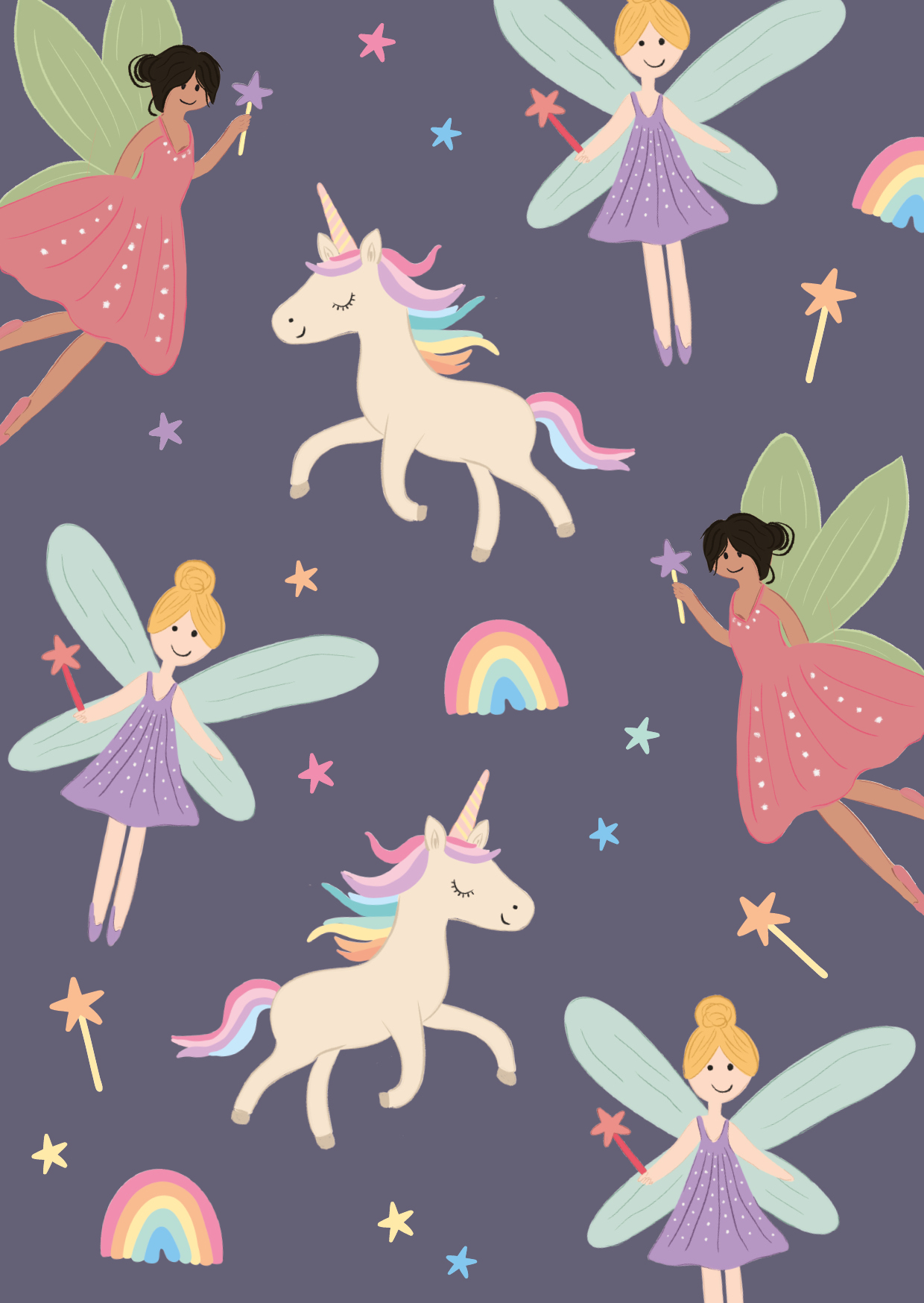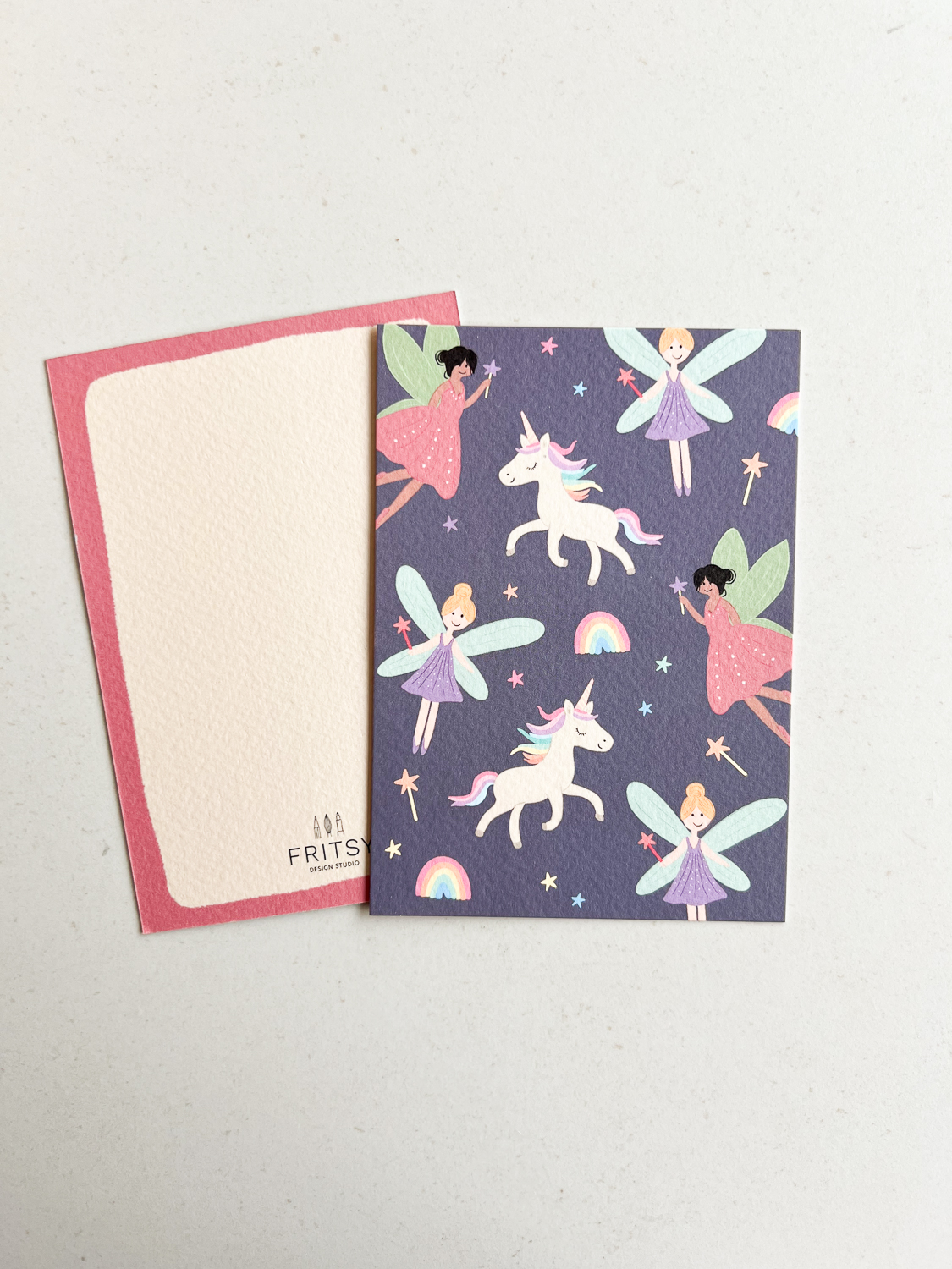 Kaart met een print van unicorns, feeën en regenbogen. De illustratie is door ons gemaakt en gedrukt op dik duurzaam papier.