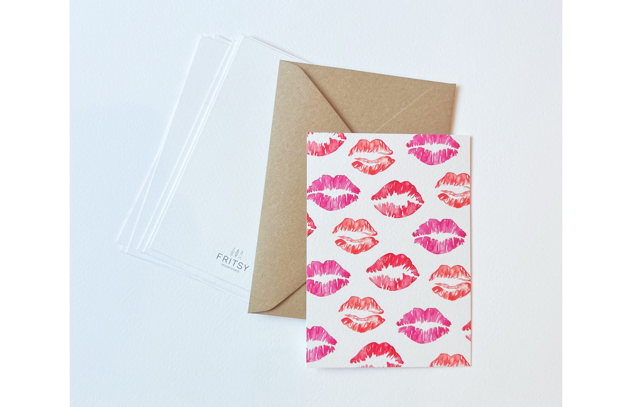 Kaart met een print van kusjes, door ons geschilderd met waterverf. De kaart is gedrukt op mooi stevig papier, dus je kan het ook neerzetten ter decoratie.